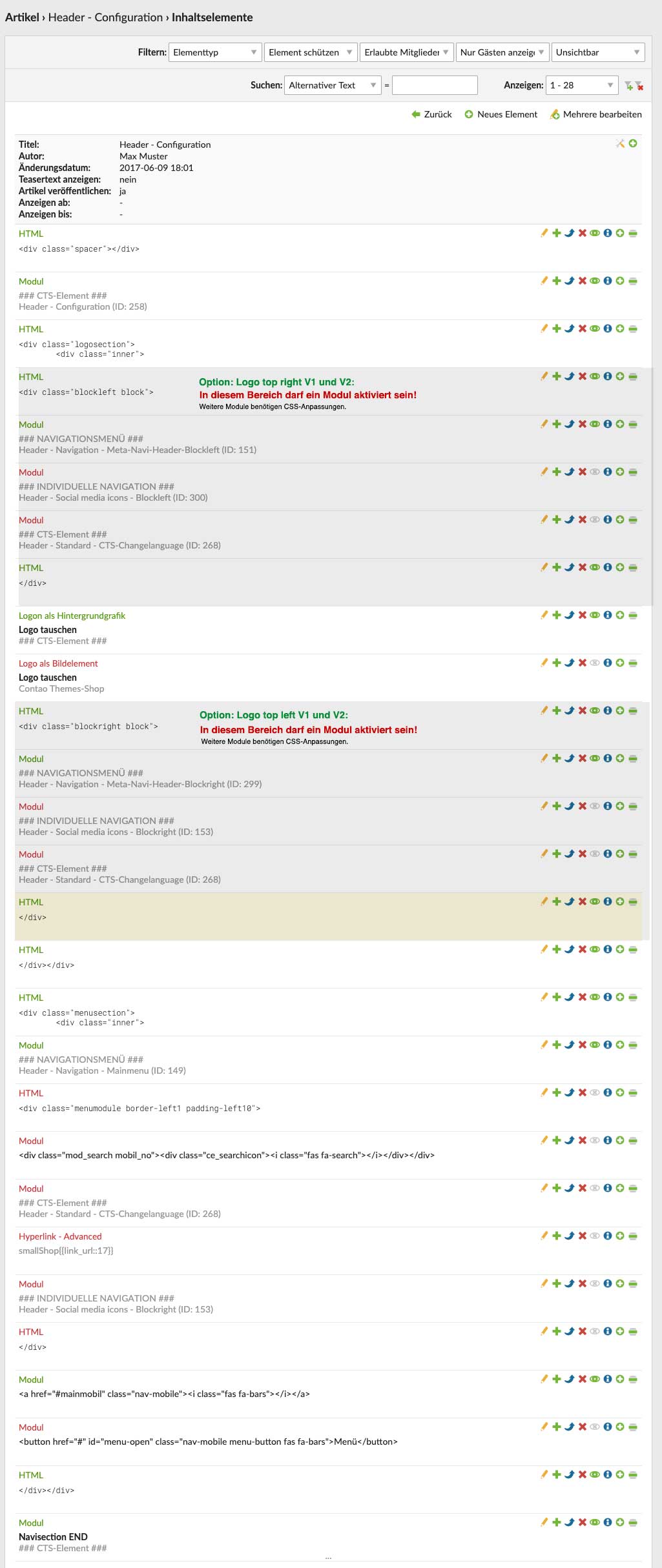 Im nachfolgenden Screenshot sehen Sie die maximal möglich Modulkonfiguration für die Logo-Navigations-Positonen Logo top left/right (V1, V2).